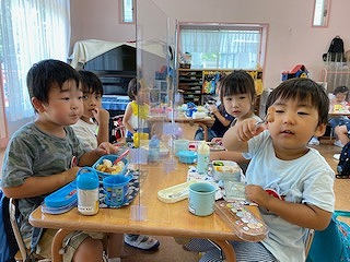 みんな幼稚園でお弁当を食べることにすっかり慣れてきました。