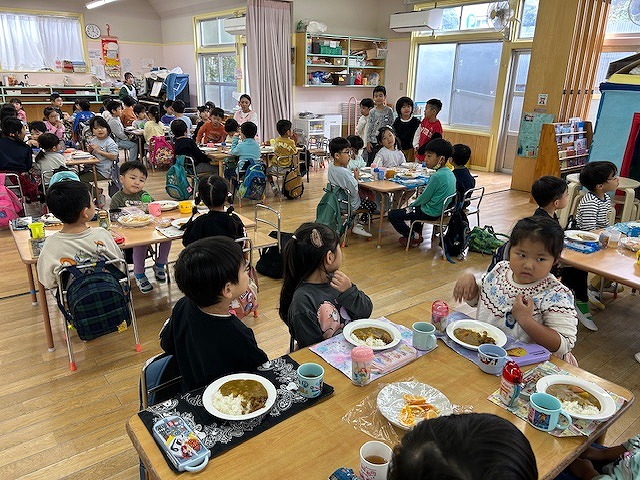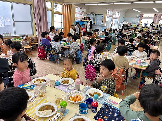 大きなお鍋とおひつにカレーとご飯がたっぷり!年齢に合わせてよそりましたが、どのクラスも「いただきます!」から3分経たないうちにお変わりの長蛇の列。3杯までと決めましたが、大きなお鍋は空っぽになりました。カレーが苦手な子どもたちもいましたが、楽しい雰囲気の中、ちょっと食べてみようかな...と一歩進めた姿が見られたことも嬉しかったです。
