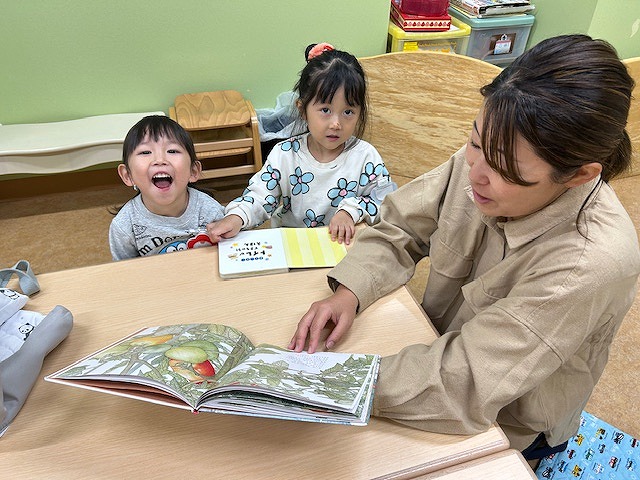 満三歳こばと組さんが図書室にやってきて、先生たちと楽しい本の時間を過ごしています。こばとさんたちも、ご本が大好き!読んだ本の内容から展開される「ごっこ遊び」も大好きです。