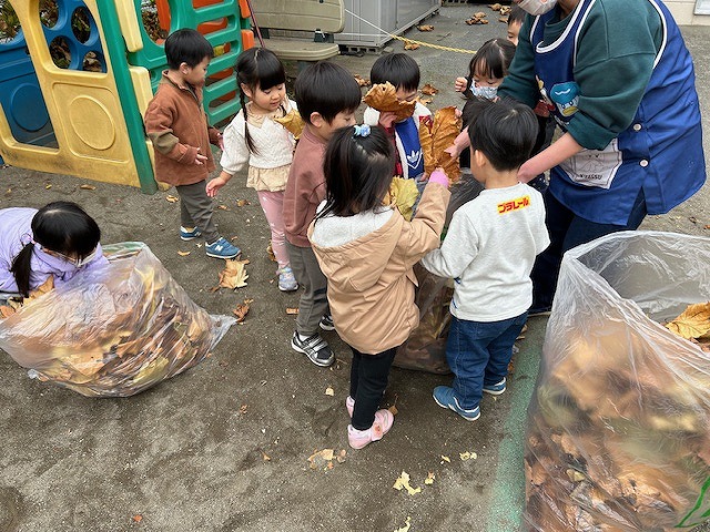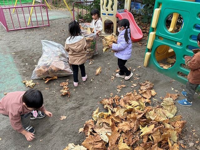 晩秋の園庭には、たくさんの落ち葉がひらひらと舞い降りてきています。その落ち葉でお面を作ったり、おままごとをして遊んだり。季節の移り変わりは、いつも子ども達に素敵なプレゼントをくれますね。今日は年少さんたちが、楽しそうにみんなで落ち葉掃きのお手伝いをしてくれていました。