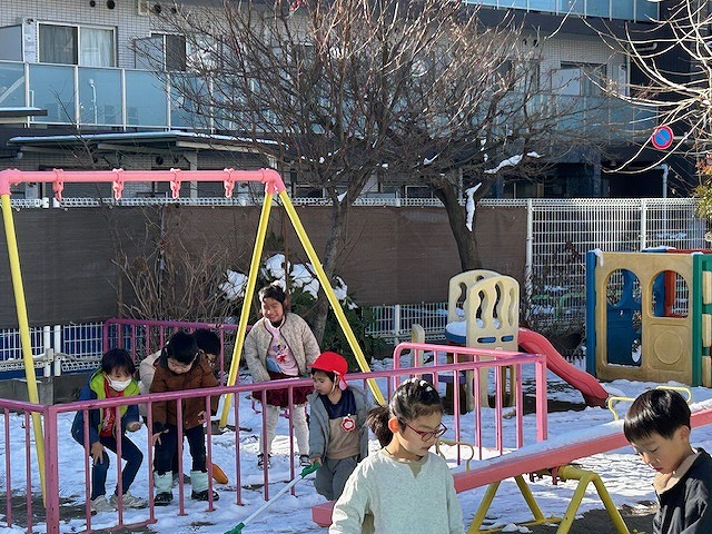 都心にも久しぶりの積雪があった翌朝。園庭を走り回り、雪と楽しく遊びました。「冷たい!」と雪を手にしながら投げ合ったり、おままごとハウスではアイスクリーム作りを楽しんでいる姿も見られました。子どもたちは雪が大好き!